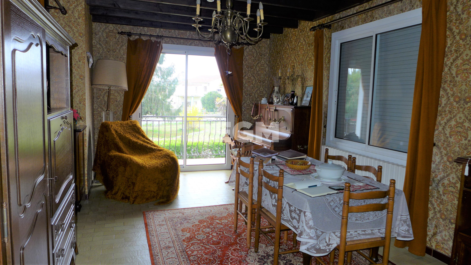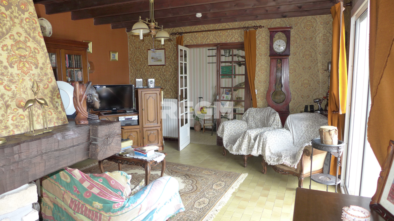 Le salon (23,95m²) et la salle à manger (20,59m²) sont séparés par un mur supportant la cheminée d'époque.