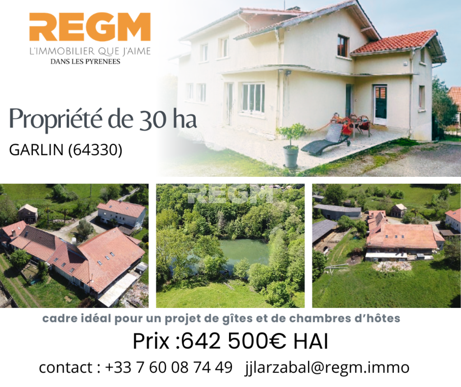 À vendre, proche de GARLIN (64330), rare propriété de 30 ha, offrant un cadre idéal pour un projet de gîtes et de chambres d’hôtes, au cœur d’un environnement agricole préservé, loin des nuisances, en pleine campagne, vue dégagée, avec un lac d'environ 5000m2.