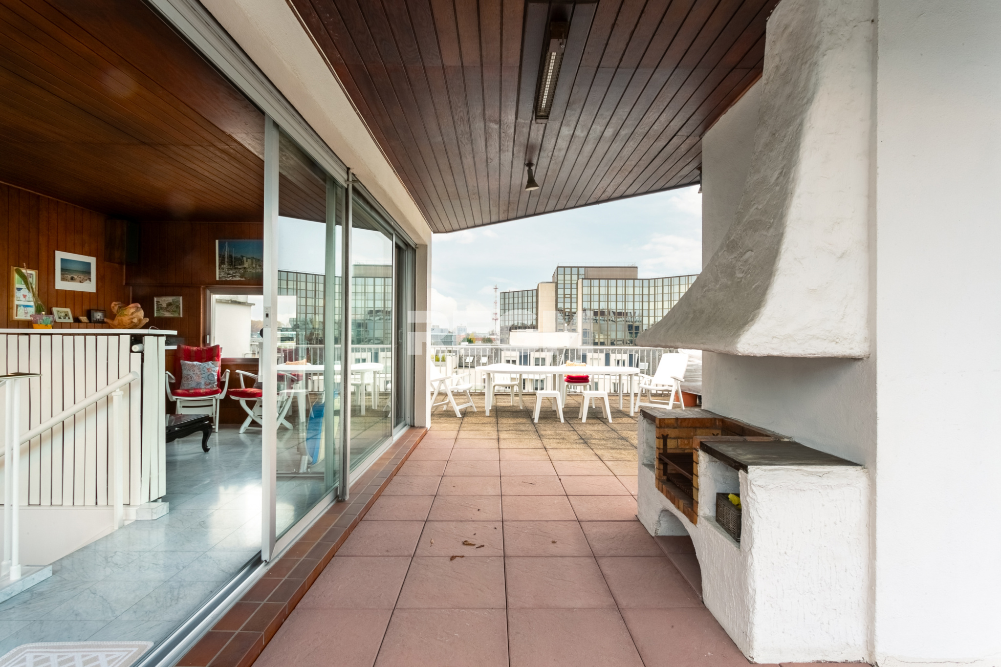 Un escalier conduit à l'attique au 5ème étage ouvrant sur le ROOFTOP de 100m2. L'attique de 20m² aménagé en salon TV avec un point d'eau et un monte charge relié à la cuisine. Le rooftop est ensoleillé toute la journée avec une zone ombragée autour de l'ilot central couvert et équipé du barbecue en brique.